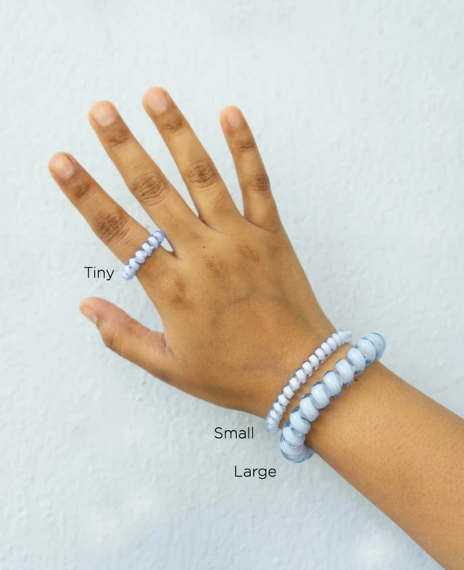 These are also completely shrinkable! Place your teletie in a dish of hot water if they appear stretched out and watch as they return to their normal size.